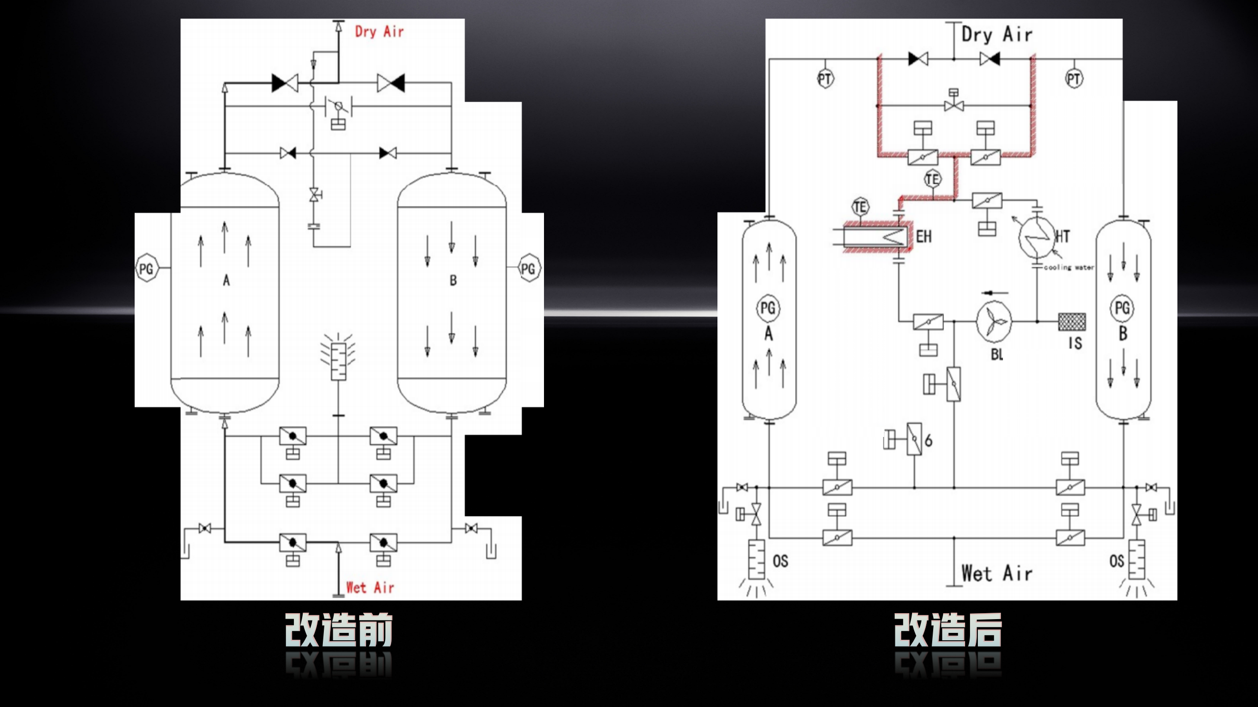 据分析,原设备为同行厂家 150 立方无热再生吸附式干燥机,我司经深入现场工况分析,创新提出‘零气耗鼓风热再生吸附式干燥机改造方案’